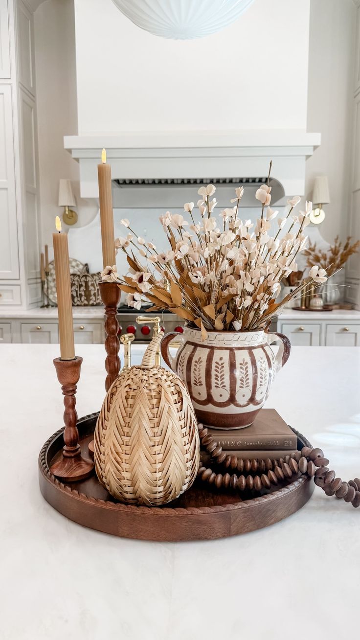 This beautiful centerpiece, set against a bright, modern kitchen, is a perfect lesson in neutral fall decorating. A dark wooden tray holds a curated collection of textures, from the warm glow of flameless pillar candles on wooden holders to a beautifully woven rattan pumpkin. A patterned ceramic vase filled with delicate dried florals adds a touch of artistic flair, all tied together with a rustic wooden bead garland. It’s a sophisticated and serene take on seasonal decor, proving that you don’t need bright orange to create a cozy, harvest-ready vibe.