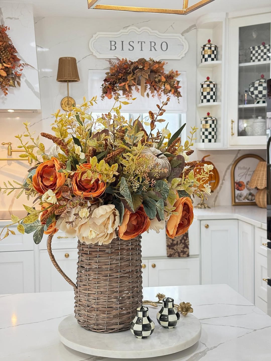 This stunning kitchen setup shows how to bring fall decor into every corner of your home. A tall wicker pitcher, overflowing with a gorgeous arrangement of burnt orange and cream florals, acts as the perfect centerpiece on the bright marble countertop. The entire display is a celebration of the season, with small decorative pumpkins and rich foliage tucked into the bouquet. What really makes this look special are the whimsical black-and-white checkerboard accents on the salt and pepper shakers and canisters in the background, adding a fun, graphic punch to the warm, elegant autumn vibe.