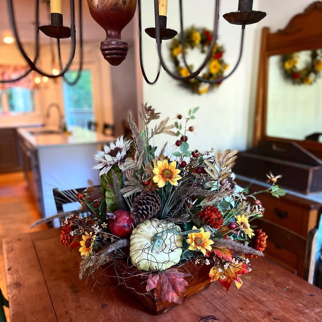This centerpiece is like a perfect little box of autumn, bringing all the best colors and textures of the season right to your table. A rustic wooden planter overflows with a vibrant mix of faux flowers, from sunny yellows to deep reds and oranges, all accented with festive berries and natural pinecones. Nestled in the center is a charming cream-colored pumpkin, making it clear this arrangement is all about celebrating fall. The warm, lush display creates an incredibly cozy and inviting atmosphere, perfect for making any meal feel like a special occasion.