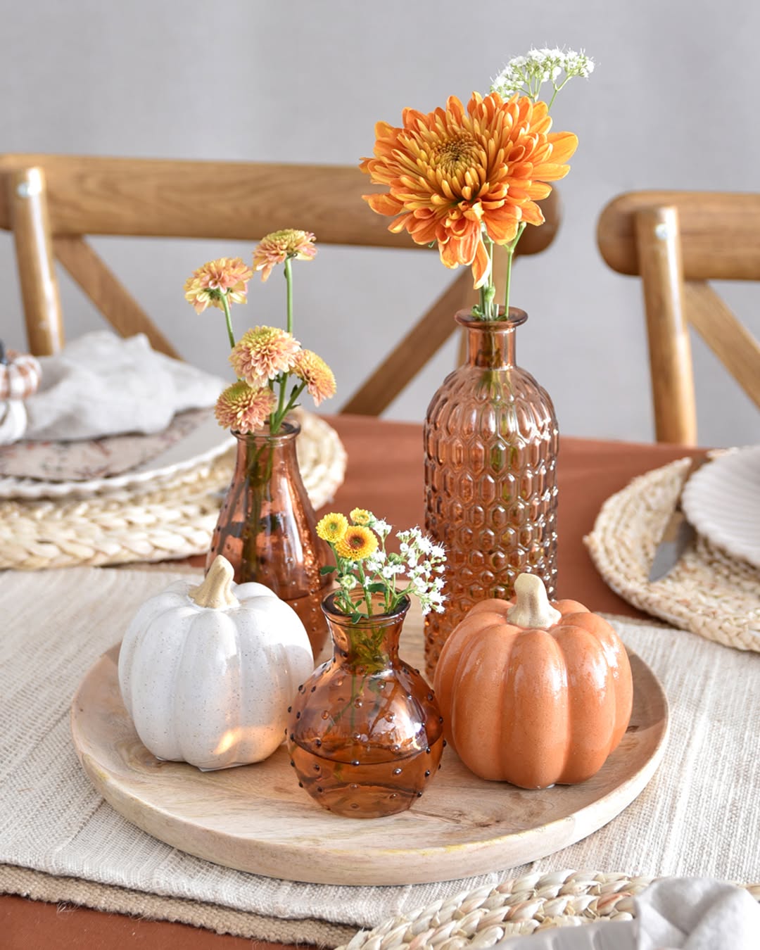 This beautiful arrangement proves that fresh flowers have a place in fall decor. A collection of amber glass vases, varying in size and texture, hold vibrant orange and yellow chrysanthemums, adding a lively touch to the table. These are artfully arranged on a light wooden tray alongside a classic white and a glossy burnt-orange pumpkin, creating a perfect balance of natural and decorative elements. The entire display is set on a layered table runner, combining a rust-colored base with a textured beige fabric. This centerpiece brings together the rich colors of the season with the simple elegance of fresh blooms, creating a warm, serene, and incredibly inviting atmosphere.