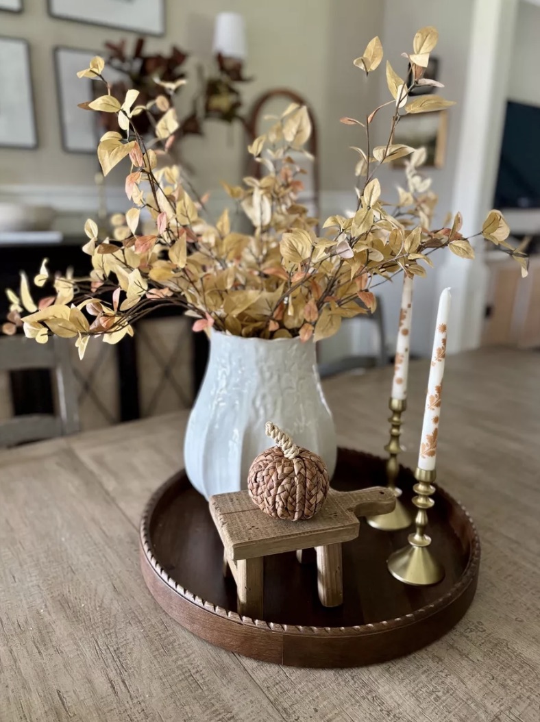 This beautiful centerpiece proves that a few well-chosen items can make a big impact. A textured white ceramic vase, filled with branches of golden autumn leaves, creates a stunning focal point. Next to it, a charming woven pumpkin sits atop a tiny rustic stool, adding a touch of farmhouse character. The arrangement is balanced by two classic brass candlesticks with beautifully patterned taper candles, bringing a hint of elegance and warmth. It’s a perfect example of how to mix rustic textures with refined details to create a cozy and sophisticated fall display.