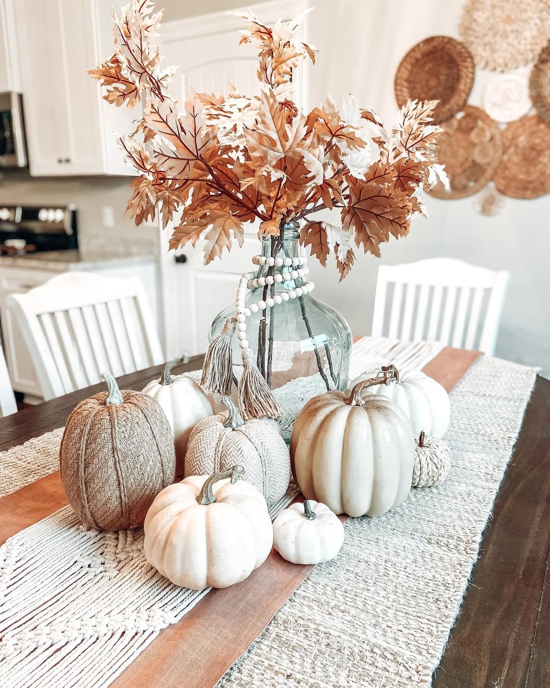 This stunning tablescape masterfully blends the rustic comfort of farmhouse style with the free-spirited textures of boho design. A beautiful off-white macrame runner, complete with fringe, lays the foundation over a rich, dark wood table, creating an immediate sense of warmth and texture. The centerpiece is a delightful collection of fabric and ceramic pumpkins in soft, neutral shades of cream, beige, and light brown, avoiding traditional orange for a more sophisticated, modern feel. A large, clear glass vase holds an arrangement of muted fall foliage, while a string of white wooden beads draped around its neck adds that perfect artisanal, boho touch. It’s an elegant and inviting look that feels both curated and effortlessly chic, perfect for anyone who loves a neutral palette with plenty of personality.